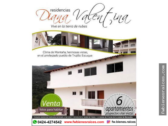 William Falconi, vende bellos apartamentos de estreno en Escuque edificio de solo 6 apartamentos, rodeado de la naturaleza, excelente clima de montaña, consta de 3 habitaciones, 2 baños, sala, comedor, piso de porcelanato, 95 mts, 1 puesto de estacionamiento.